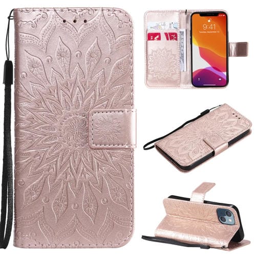 Funda para iPhone 13 Mini Cuero de PU Flip Horizontal Patrón Girasol Ranuras para Tarjetas Billetera Cordón (Oro Rosa)