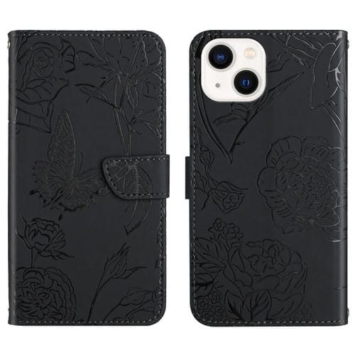 Funda de Cuero iPhone 13 Mini Skin Feel Butterfly Peony En Relieve (Negro)