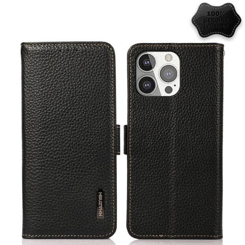 Funda para iPhone 13 Pro Khazneh Side-Magnetic Litchi Cuero Genuino Rfid (Negro)