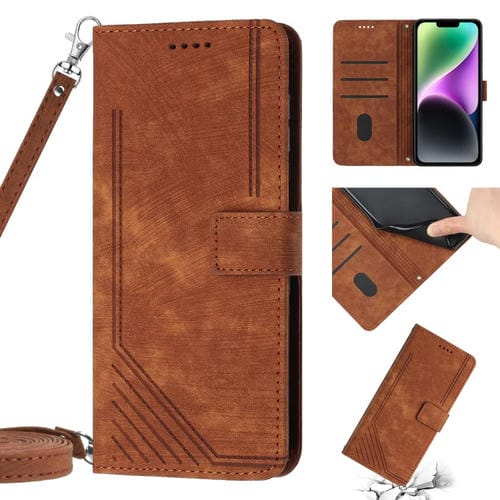 Funda para iPhone 13 Pro Max Skin Feel Stripe Pattern de Cuero con Cordón (Marrón)