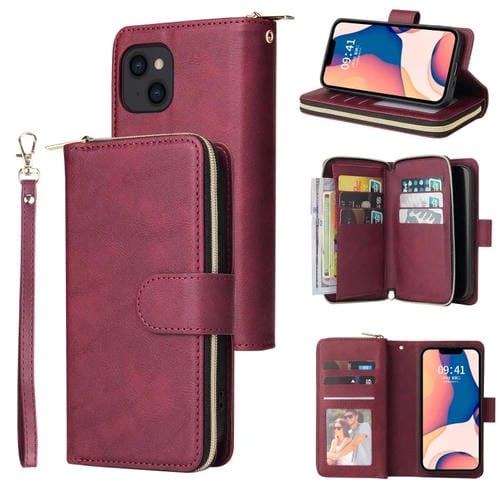 Funda para iPhone 14 Monedero de Cuero con 9 Ranuras para Tarjetas y Cremallera (Rojo Vino)