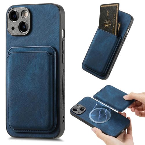 Funda magnética para teléfono iPhone 14 con bolsa de tarjeta de cuero retro (Azul)