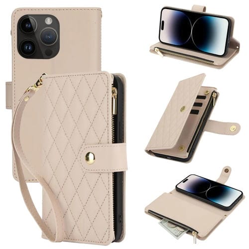 Funda de Cuero Ym016 para iPhone 14 Pro Max con Billetera, Tarjeta, Cremallera Rómbica y Cordón (Albaricoque)