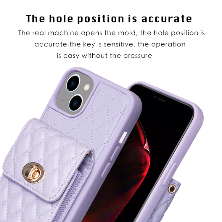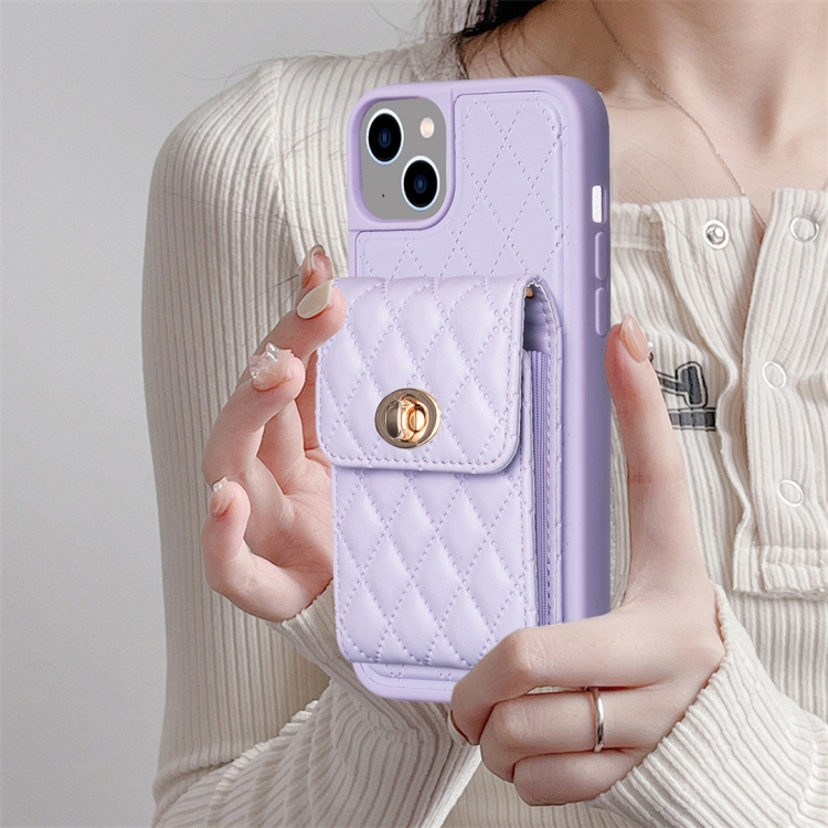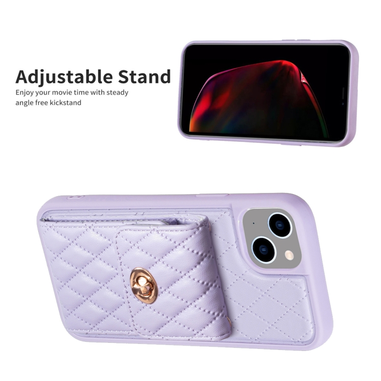 Funda para iPhone 14 Rombal de Cuero con Hebilla de Metal Vertical (Púrpura)