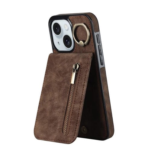 Estuche para teléfono iPhone 15 con ranura para tarjeta RFID anillo retro y cremallera (Marrón)