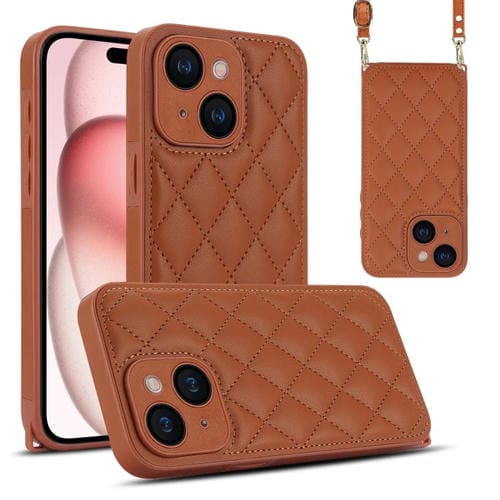 Estuche para Teléfono iPhone 15 Textura Rómbica Cordón Doble (Marrón)