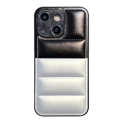 Funda para Teléfono iPhone 15 Chaqueta de Plumón con Bloques de Color (Negro Plateado)