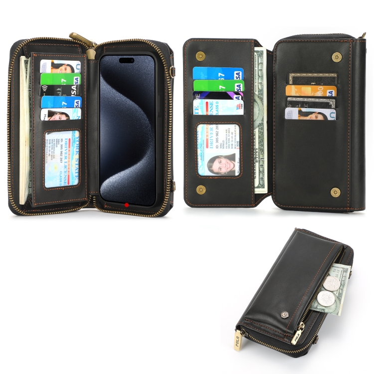 Funda para Teléfono iPhone 15 Cuero con Billetera y Cremallera Multifuncional Cruzada (Negro)
