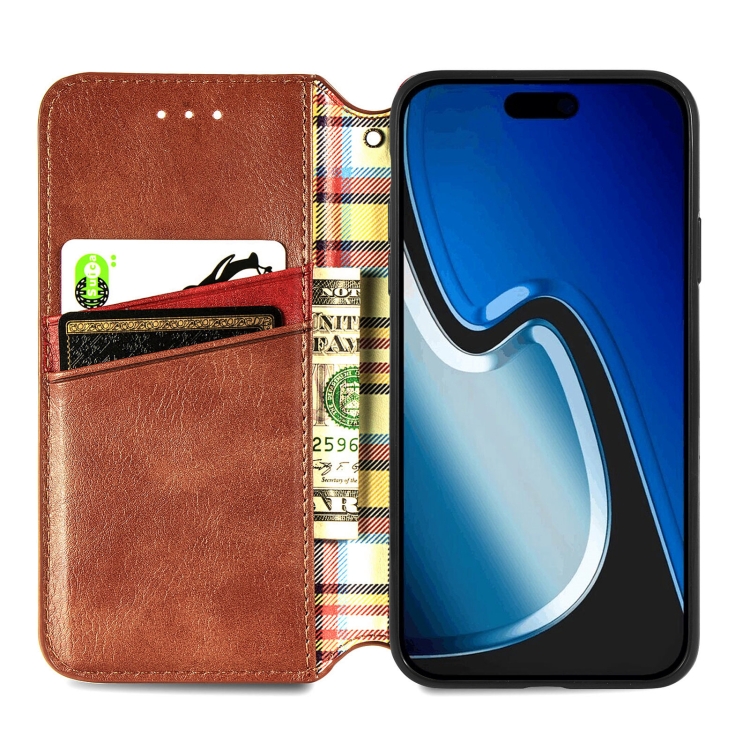 Funda para Teléfono iPhone 15 Cuero Magnético Prensado Rejilla Cúbica (Marrón)