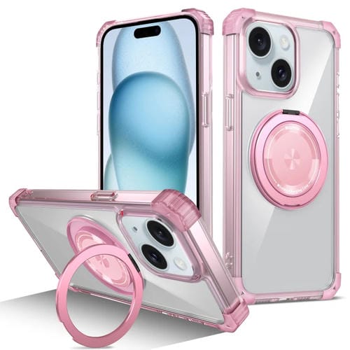Estuche para iPhone 15 Gold Shield Cd Pattern Magnético con Soporte Giratorio (Rosa Transparente)
