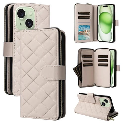 Funda Cruzada de Cuero para iPhone 15 Plus 14 Plus con Hebilla Torre y Cremallera Rómbica (Beige)