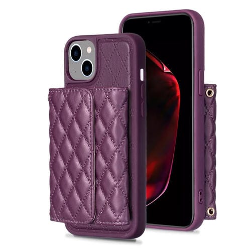 Estuche de Teléfono para iPhone 15 Plus Cuero Rómbico con Billetera Horizontal (Púrpura Oscuro)