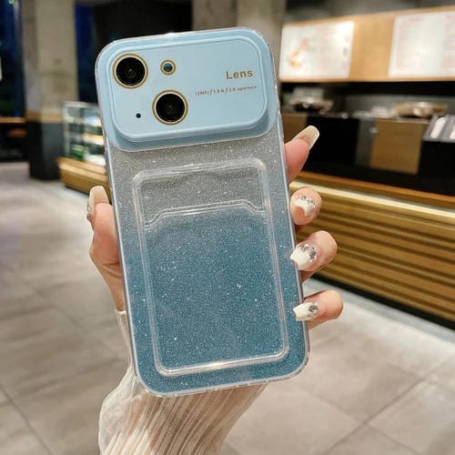 Estuche para Teléfono iPhone 15 Plus Brillo Degradado Ventana Grande Ranura para Tarjeta (Azul)