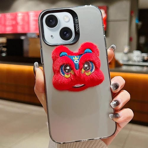 Funda para Teléfono iPhone 15 Plus Muñeco de Peluche Danza del León Rojo con Parte Posterior Gris