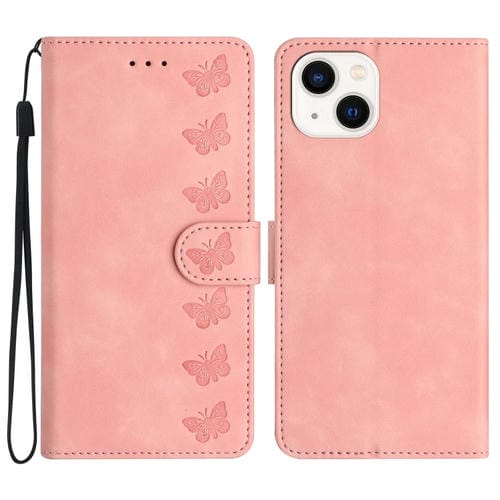 Estuche para Teléfono iPhone 15 Plus Seven Butterflies Cuero En Relieve (Rosa)