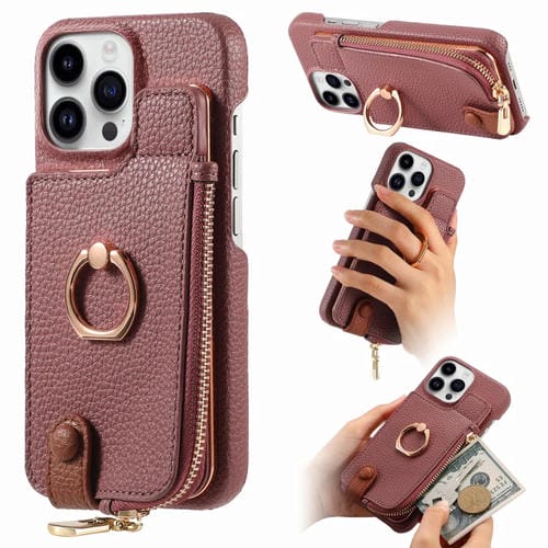 Funda Trasera para iPhone 15 Pro con billetera, cremallera y anillo de cuero litchi (Albaricoque Azufaifa)