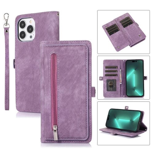 Funda de Cuero para iPhone 15 Pro Max con Cremallera Ranura para Tarjeta y Hebilla (Púrpura)
