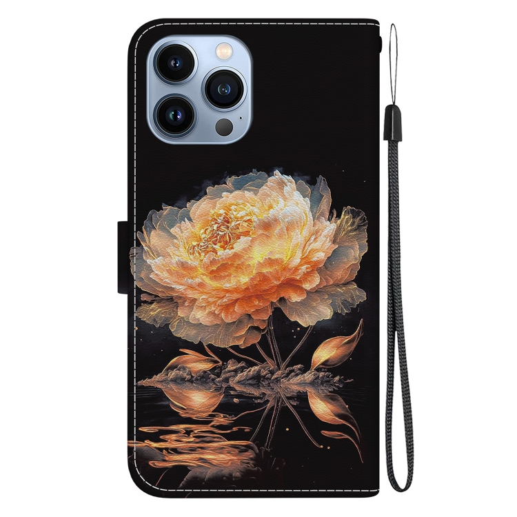 Estuche para teléfono iPhone 15 Pro Max Cuero Dibujo Coloreado Textura de Cristal (Peonía Dorada)