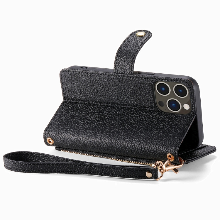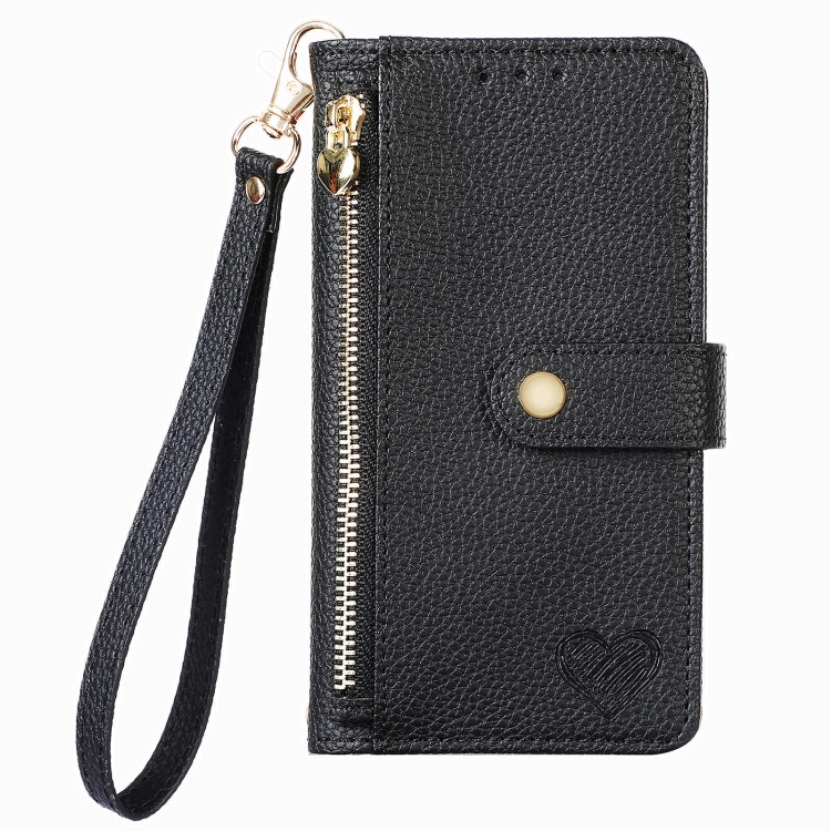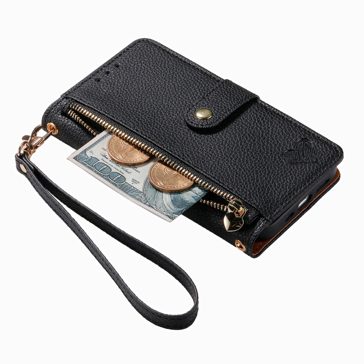 Funda de Cuero Love Zipper Lanyard para iPhone 15 Pro Max (Negro)