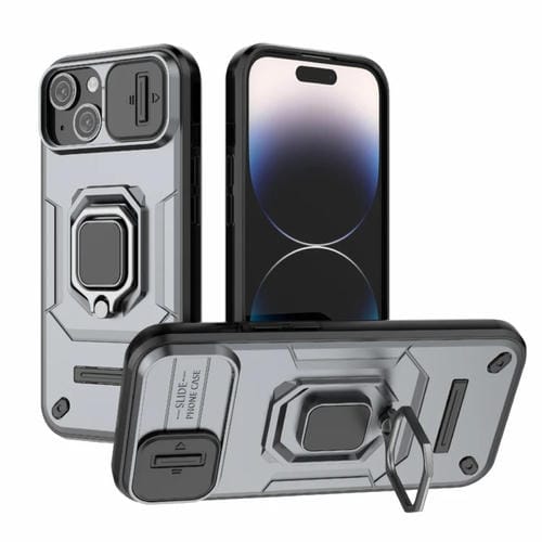 Estuche para teléfono iPhone 15 Sliding Camshield TPU + PC a prueba de golpes con soporte (Gris)