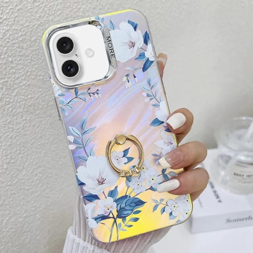 Caja de Teléfono TPU para iPhone 16 Plus con Soporte de Anillo y Flor Láser (Blanca)