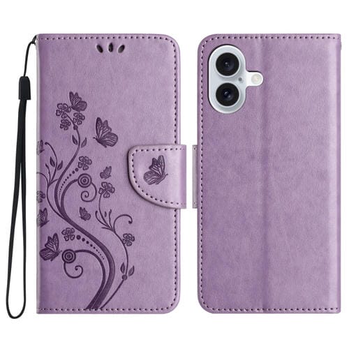 Funda para teléfono iPhone 16 Plus Cuero con Tapa Patrón Flores Mariposa (Púrpura Claro)