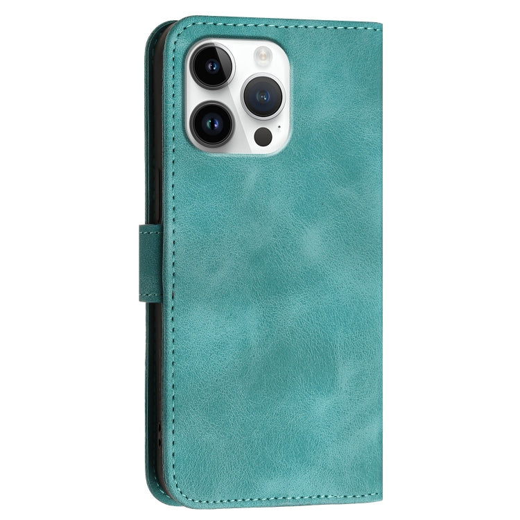 Funda de Cuero para iPhone 16 Pro Max Yx0080 con Tapa y Patrón en Relieve de Mariposa y Cuadrícula con Cordón (Azul Claro)