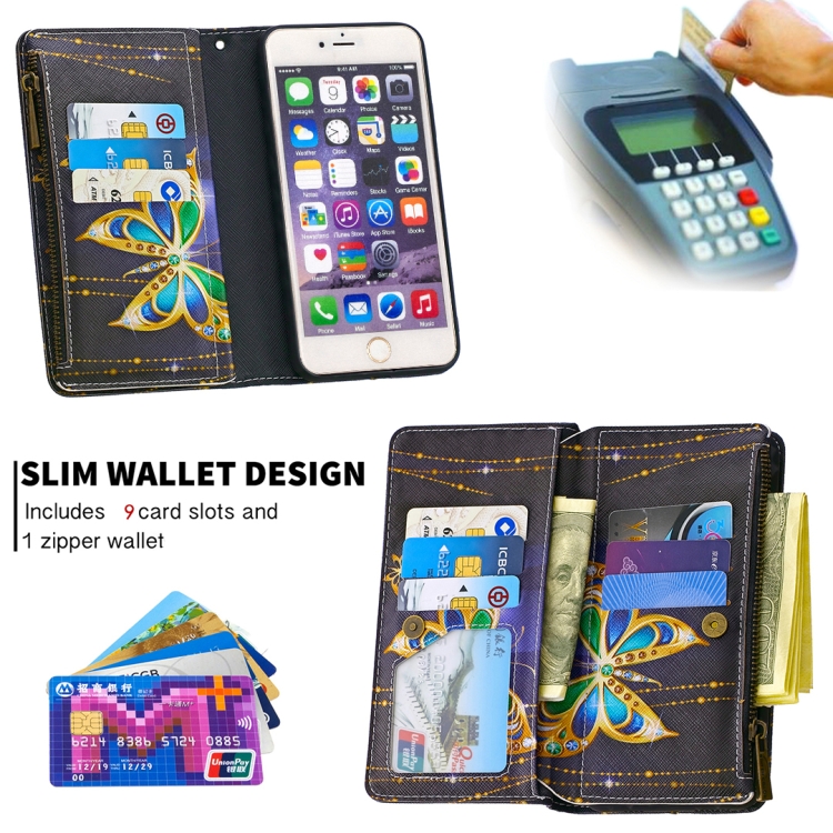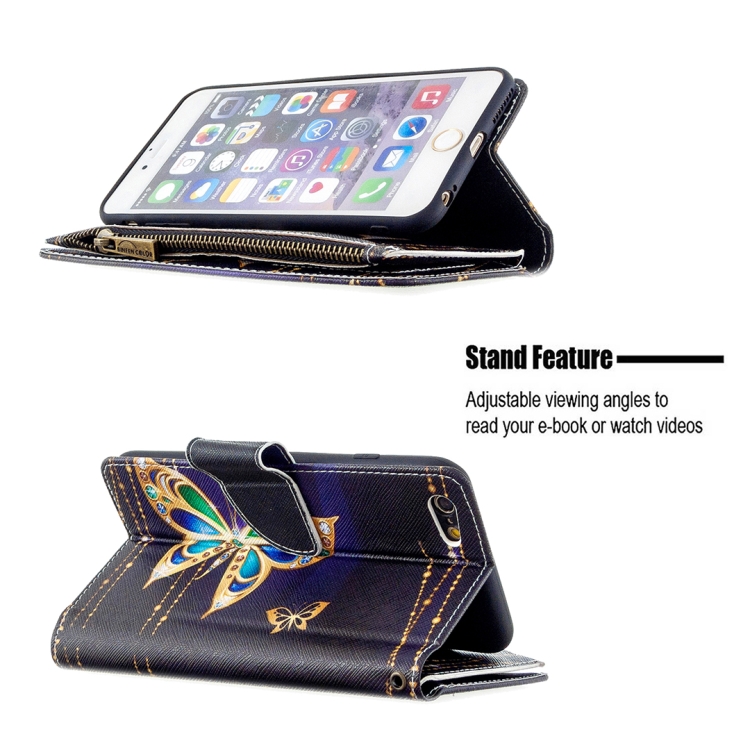 Funda de Cuero iPhone 6S Plus y 6 Plus Patrón Dibujo Colores Cremallera Tapa Horizontal Soporte Ranuras Tarjetas Billetera (Mariposa Grande)