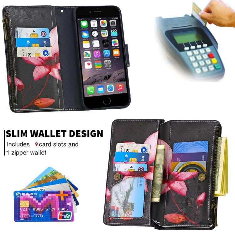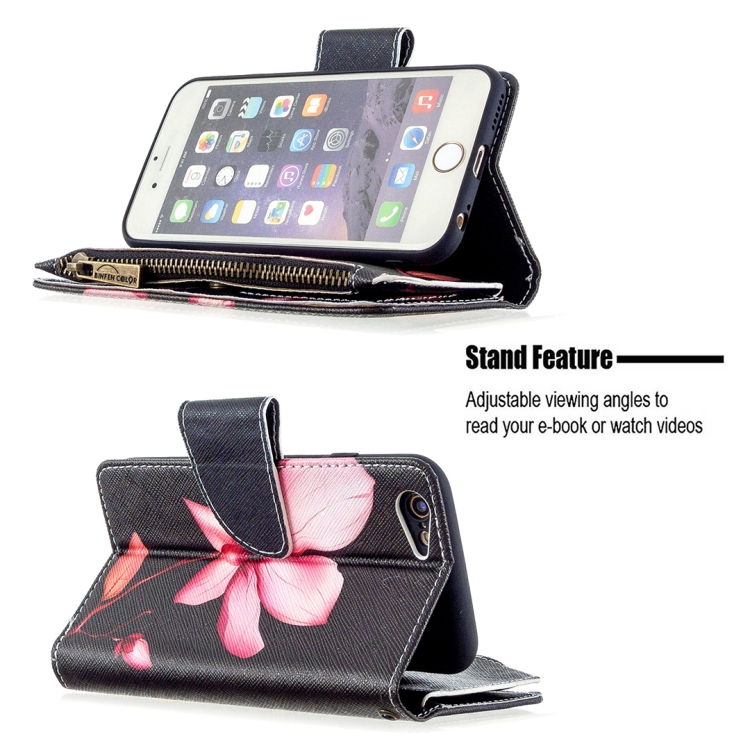 Funda de cuero iPhone 6S y 6 Lotus con patrón de dibujo, cremallera, tapa horizontal, soporte y ranuras para tarjetas