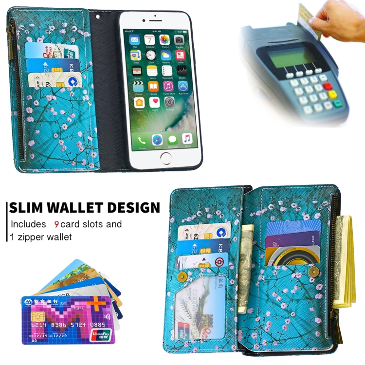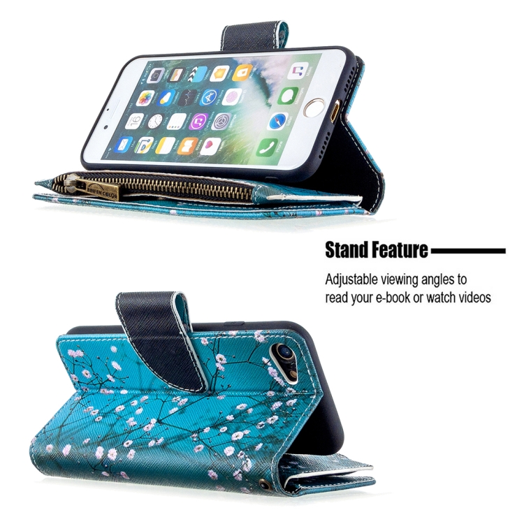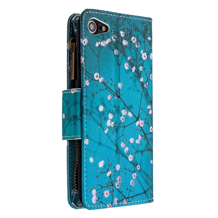 Funda de Cuero para iPhone 8 y 7 con Patrón de Dibujo, Cremallera, Tapa Horizontal, Soporte y Ranuras para Tarjetas (Plum Blossom)
