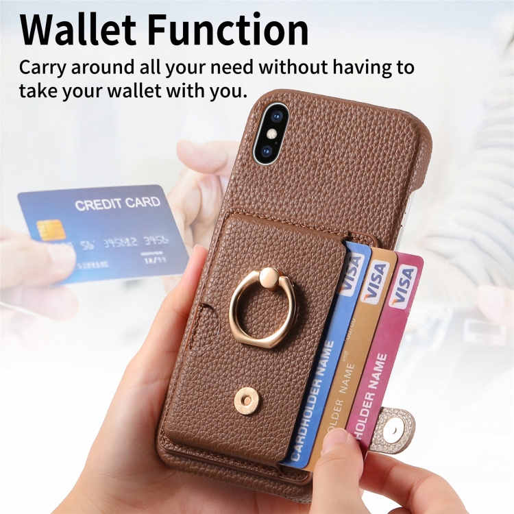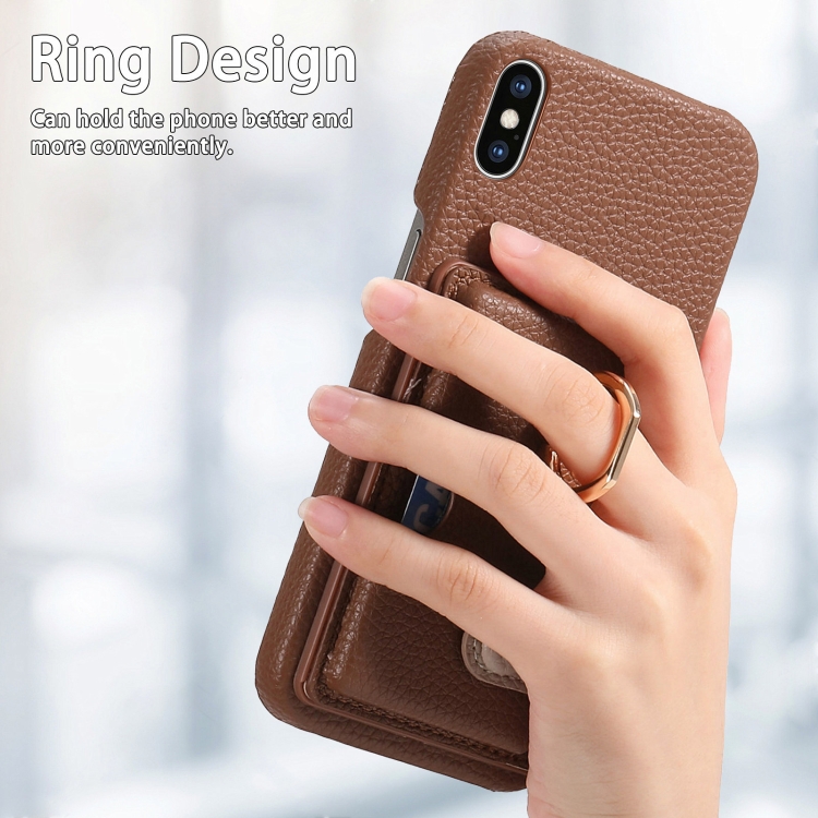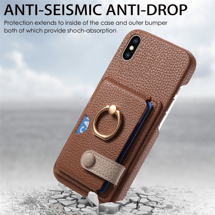Funda para Teléfono iPhone X / Xs con Parte Posterior de Tarjeta y Anillo de Borde de Aceite de Cuero Litchi (Marrón)