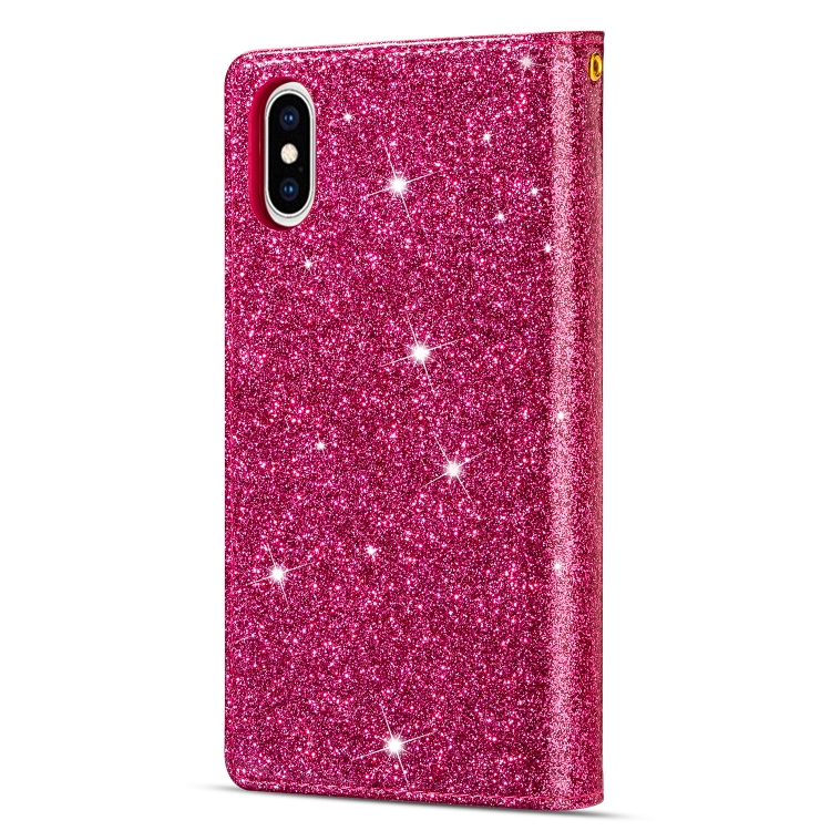 Funda de Cuero iPhone X Xs Ranuras para Tarjetas Múltiples Starry Sky Laser Carving Glitter con Tapa Horizontal Soporte Billetera y Cordón (Rose Red)