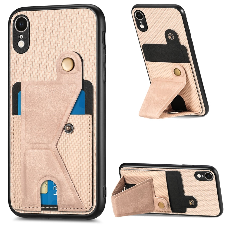 Funda Cartera para iPhone Xr Fibra de Carbono Flip Card con Soporte en Forma de K (Caqui)