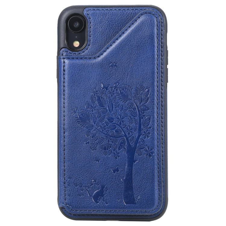 Estuche protector para iPhone Xr Cat Tree con patrón relieve, ranuras para tarjetas y marco de fotos (Azul)