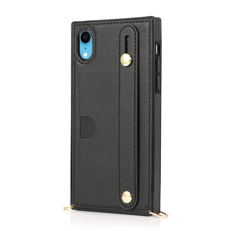 Correa de Muñeca PU + Funda TPU para iPhone Xr a Prueba de Golpes con Cordón Cruzado Soporte y Ranura para Tarjeta (Negro)