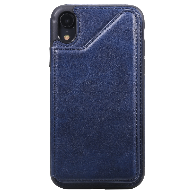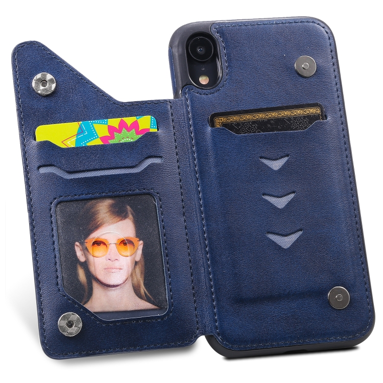 Funda Protectora para iPhone Xr con Textura de Pantorrilla, Soporte, Ranuras para Tarjetas y Marco (Azul)
