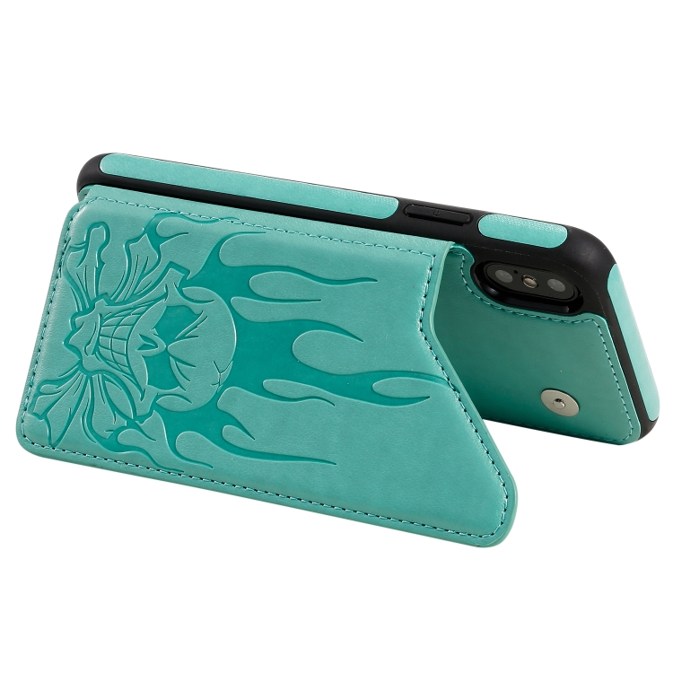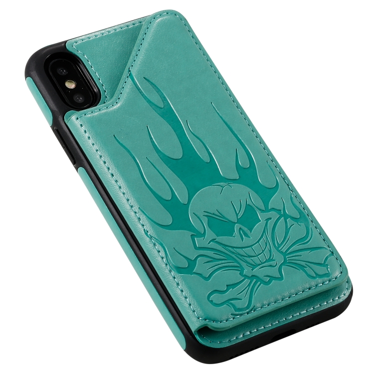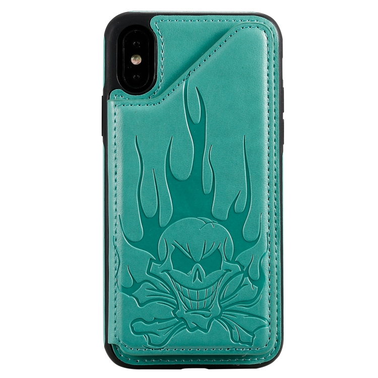 Estuche Protector para iPhone Xs Max Skull Head Patrón en Relieve a Prueba de Golpes con Soporte y Ranuras para Tarjetas y Billetera (Verde)
