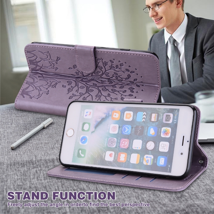 Funda de cuero para iPhone Xs Max Tree & Deer patrón prensado impresión horizontal flip (Púrpura)