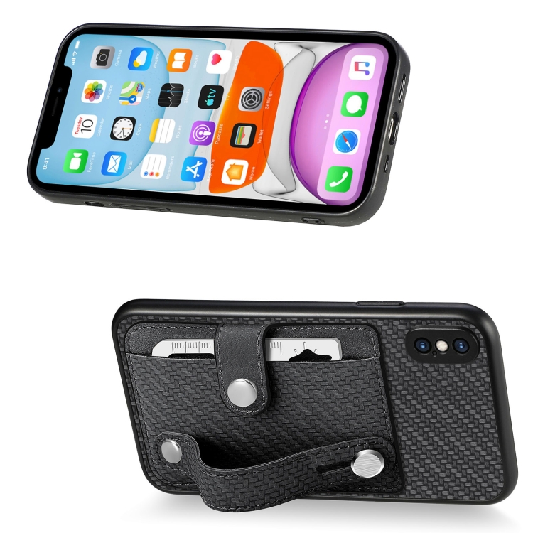 Funda para iPhone Xs Max Wristband Kickstand Card Wallet Back Cover Phone Case con Tool Knife (Negro)