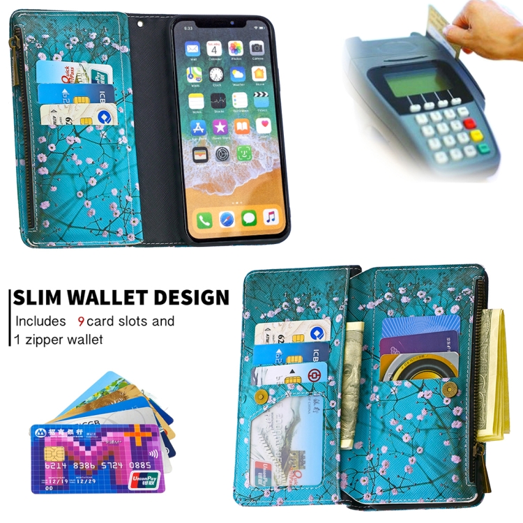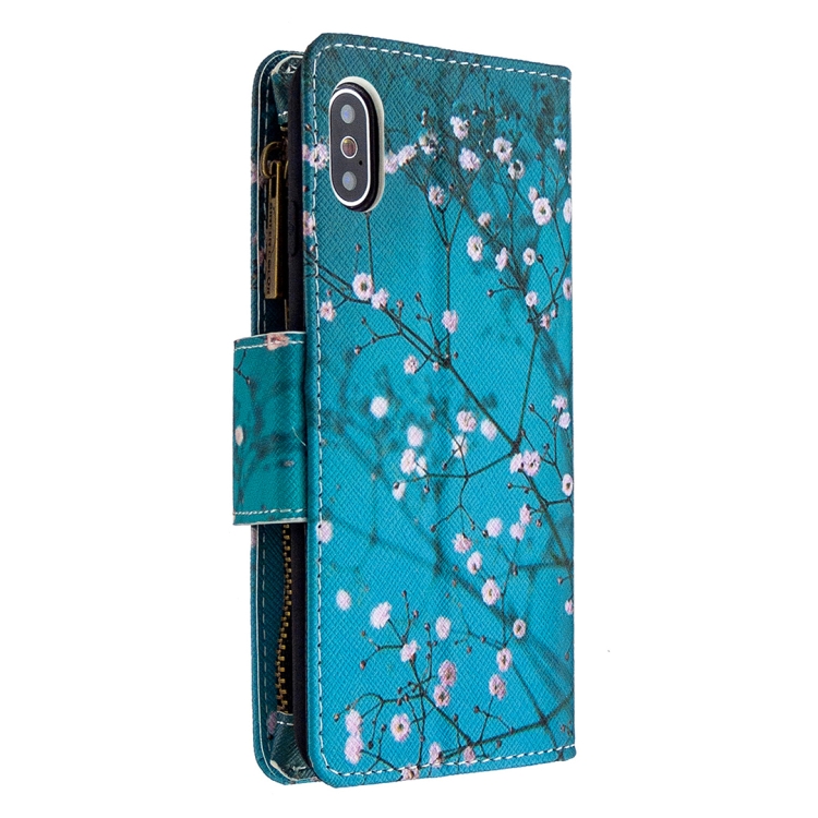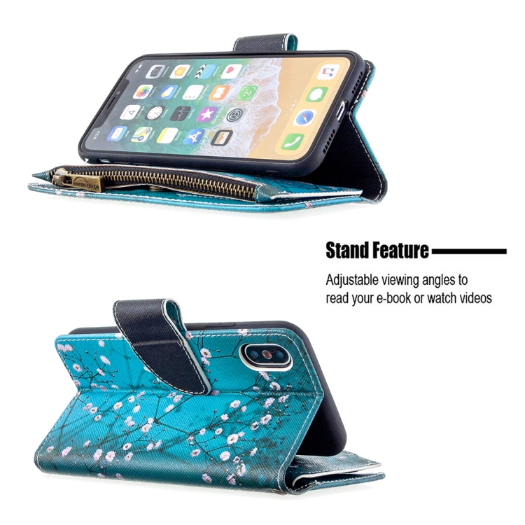 Funda de Cuero iPhone Xs X con Tapa Horizontal Soporte Ranuras Tarjetas Billetera (Plum Blossom)