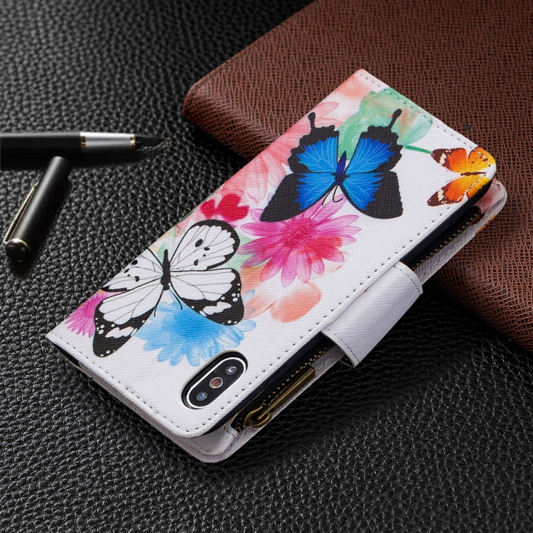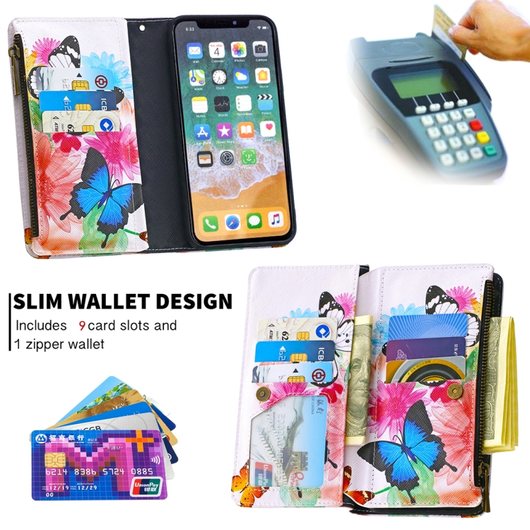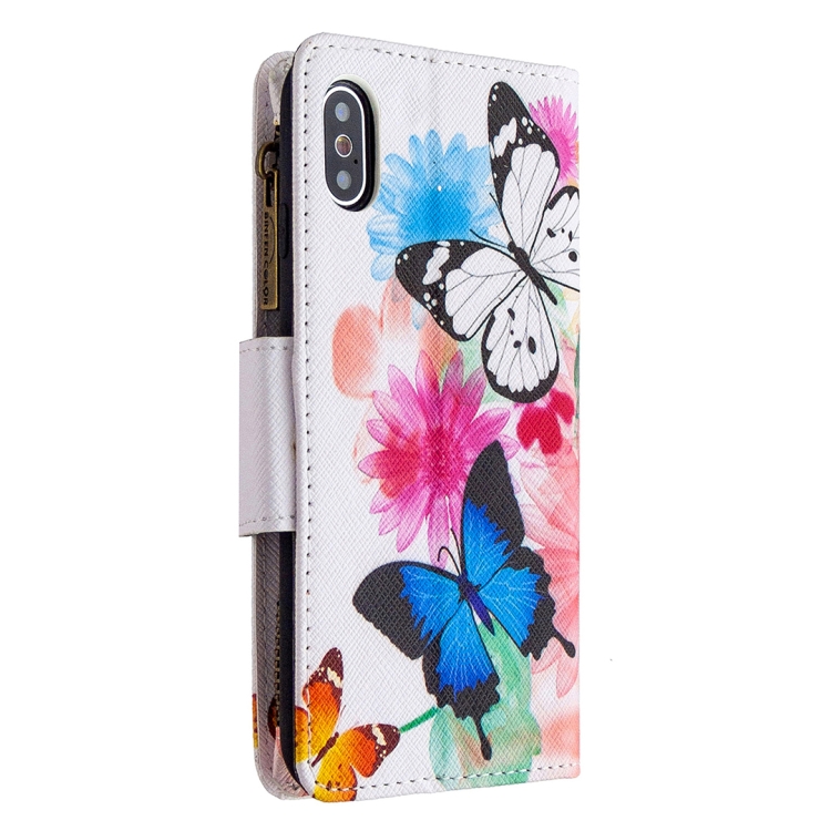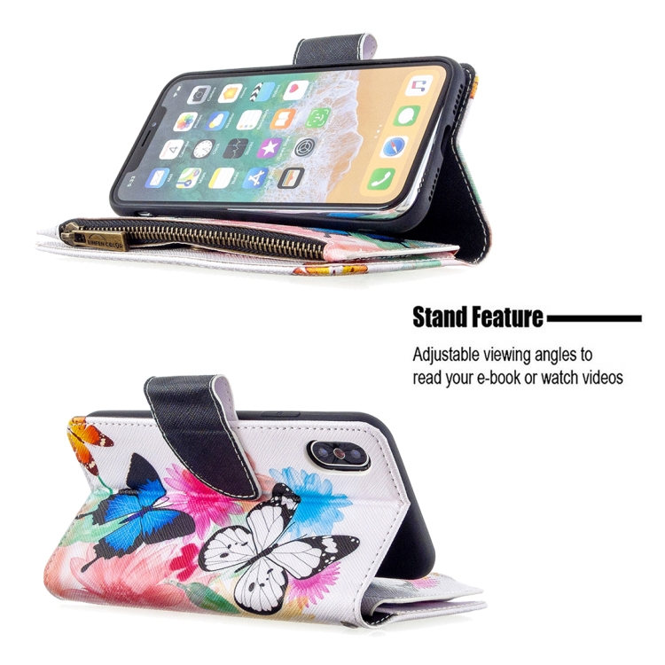 Funda de Cuero para iPhone Xs / X con Tapa Horizontal, Soporte, Ranuras para Tarjetas y Billetera (Dos Mariposas)