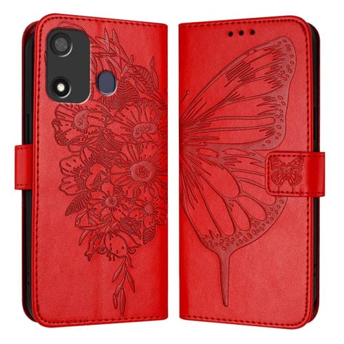 Funda de Cuero para Itel P17 y A27 con Mariposa en Relieve (Rojo)