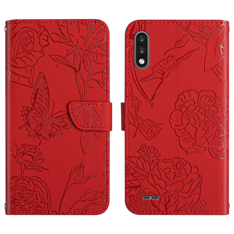 Funda de Cuero en Relieve Peonía y Mariposa para LG K22 (Rojo)