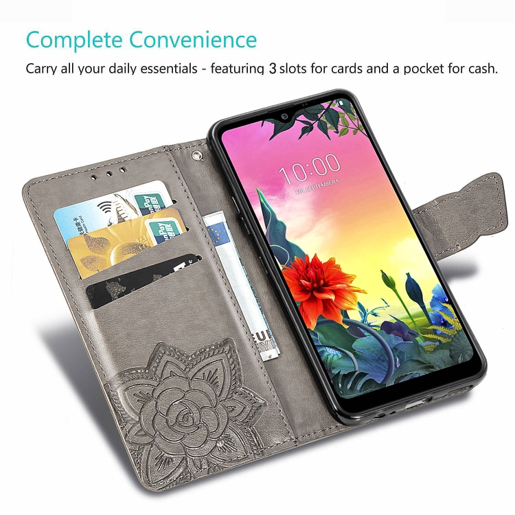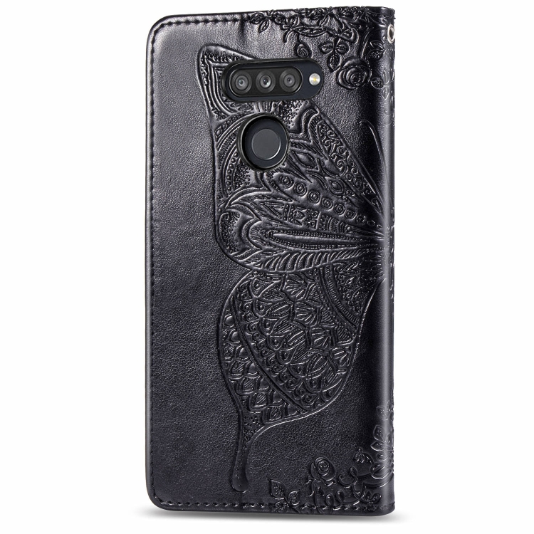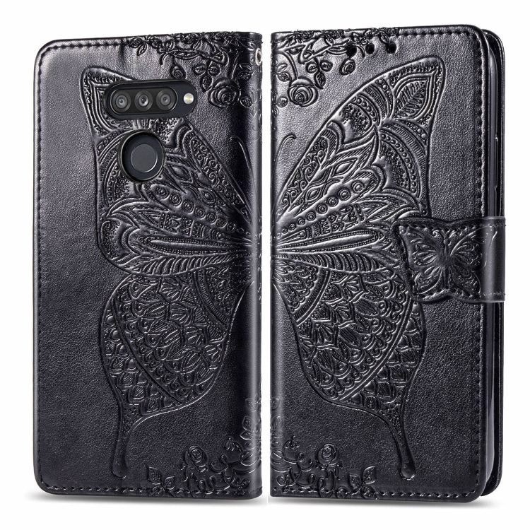 Funda de Cuero LG K50S Butterfly Love Flower con Tapa Horizontal, Soporte, Ranura para Tarjeta y Cordón (Negro)