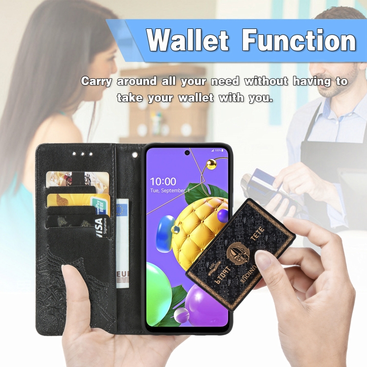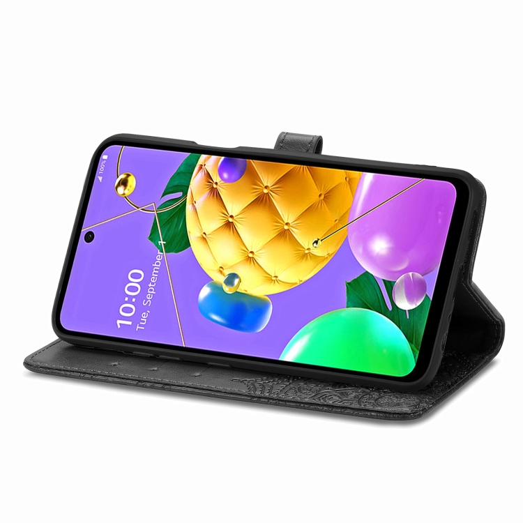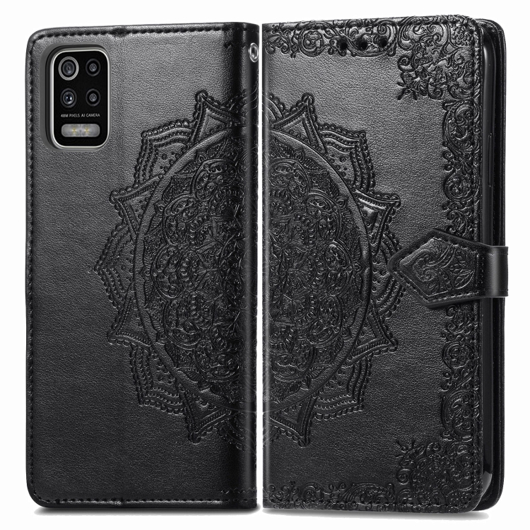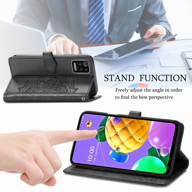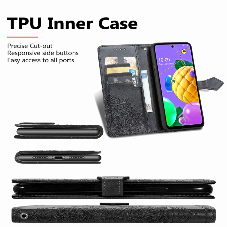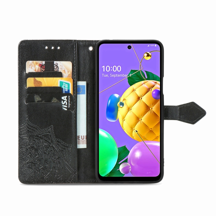 Funda de Cuero LG K52 Mandala Flower con Tapa Horizontal, Soporte, Ranuras para Tarjetas y Cordón (Negro)