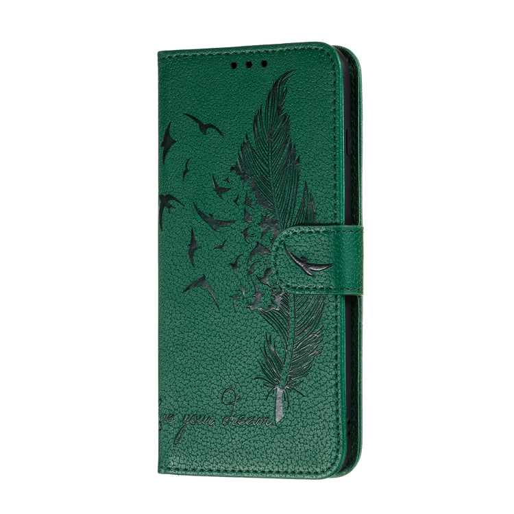 Estuche de Cuero para LG K61 con Tapa Horizontal, Textura Litchi, Diseño Plumas, Billetera y Soporte (Verde)