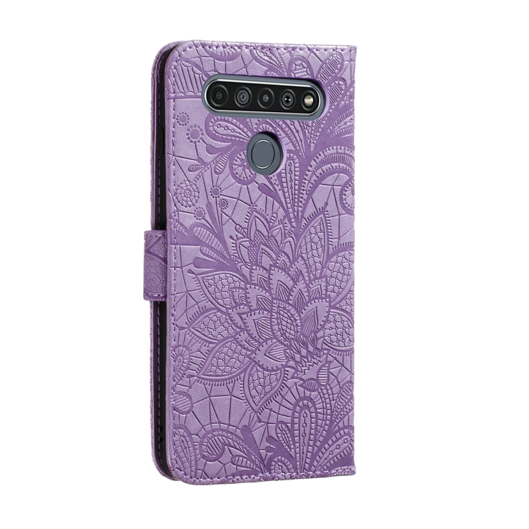 Funda de Cuero para LG K61 Lace Flower con Tapa Horizontal, Soporte, Ranuras para Tarjetas y Marco de Fotos (Púrpura)