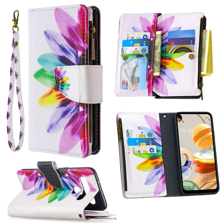 Funda de Cuero para LG K61 con Patrón de Dibujo, Cremallera, Soporte, Ranuras y Billetera (Sun Flower)
