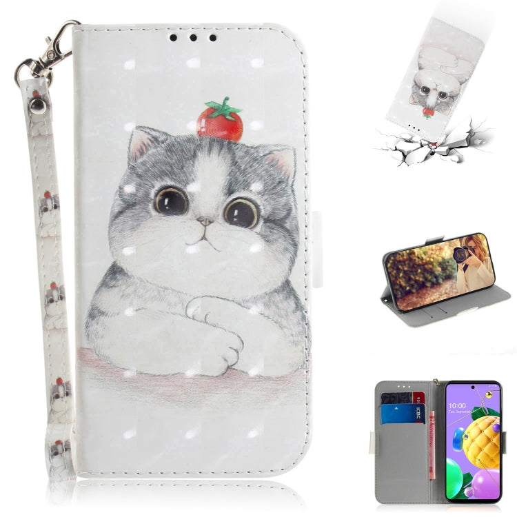 Funda Cuero Abatible Horizontal para LG Q52 con Dibujo 3D, Soporte, Ranuras y Cordón (Cute Cat)