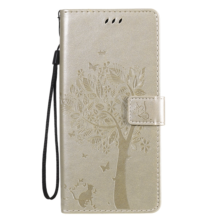 Funda de Cuero para LG Stylo 6 con Tapa Horizontal, Patrón Árbol y Gato, Soporte, Ranuras y Cordón (Dorado)